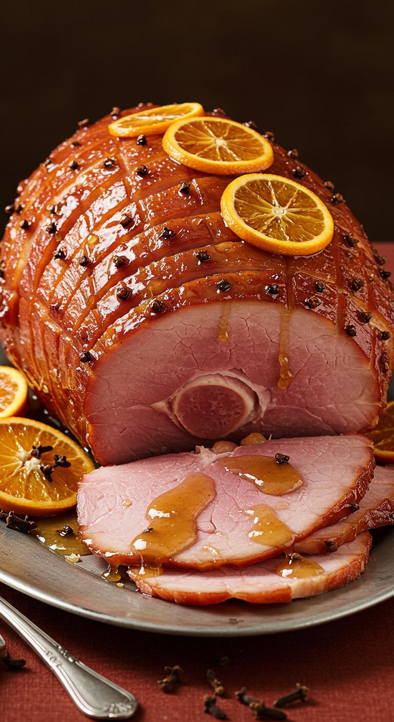 - Preheat oven to 325°F (165°C). Score the surface of the ham and stud with cloves.
