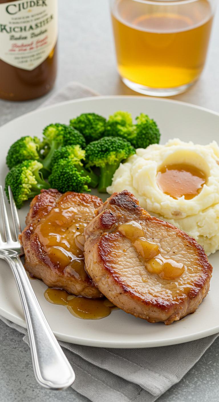 - Add cider and sugar; simmer until sauce thickens and chops are cooked through.