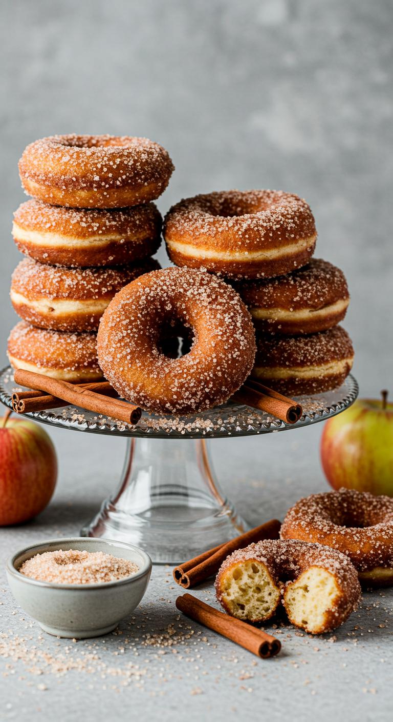 - Fill donut pans and bake at 350°F (175°C) for 10-15 minutes, then roll in cinnamon sugar.