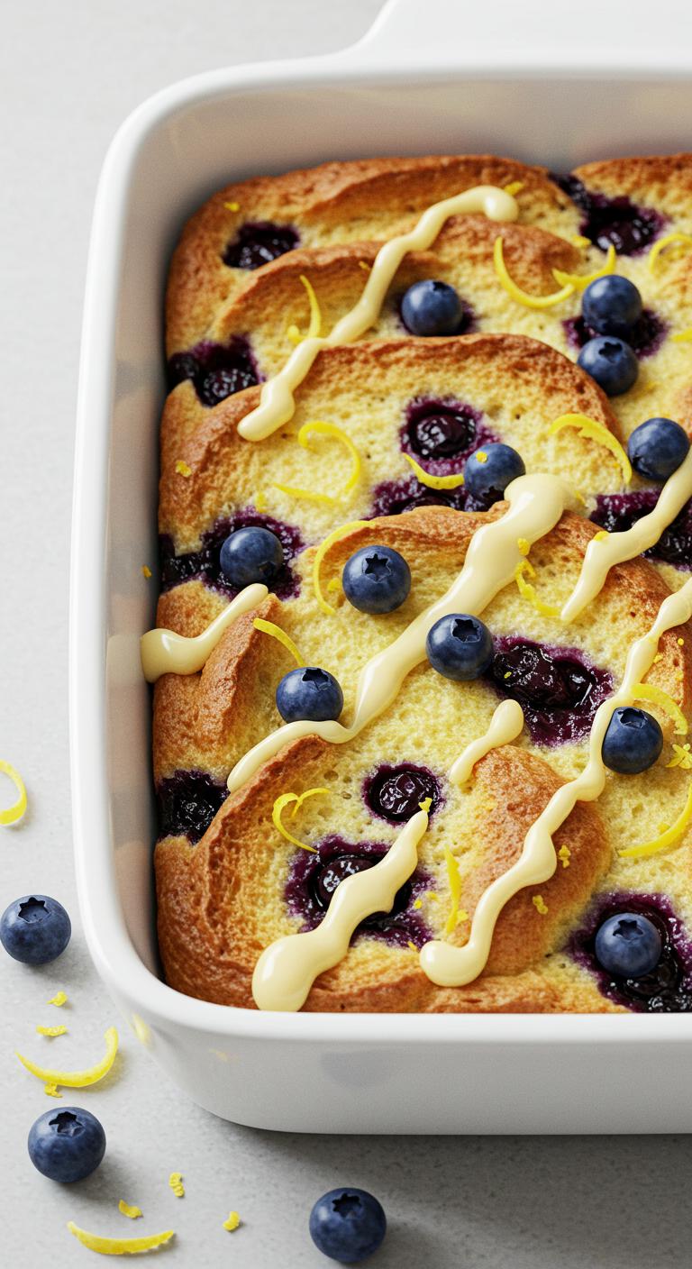 - Combine milk, eggs, sugar, and lemon zest; stir in bread and blueberries.