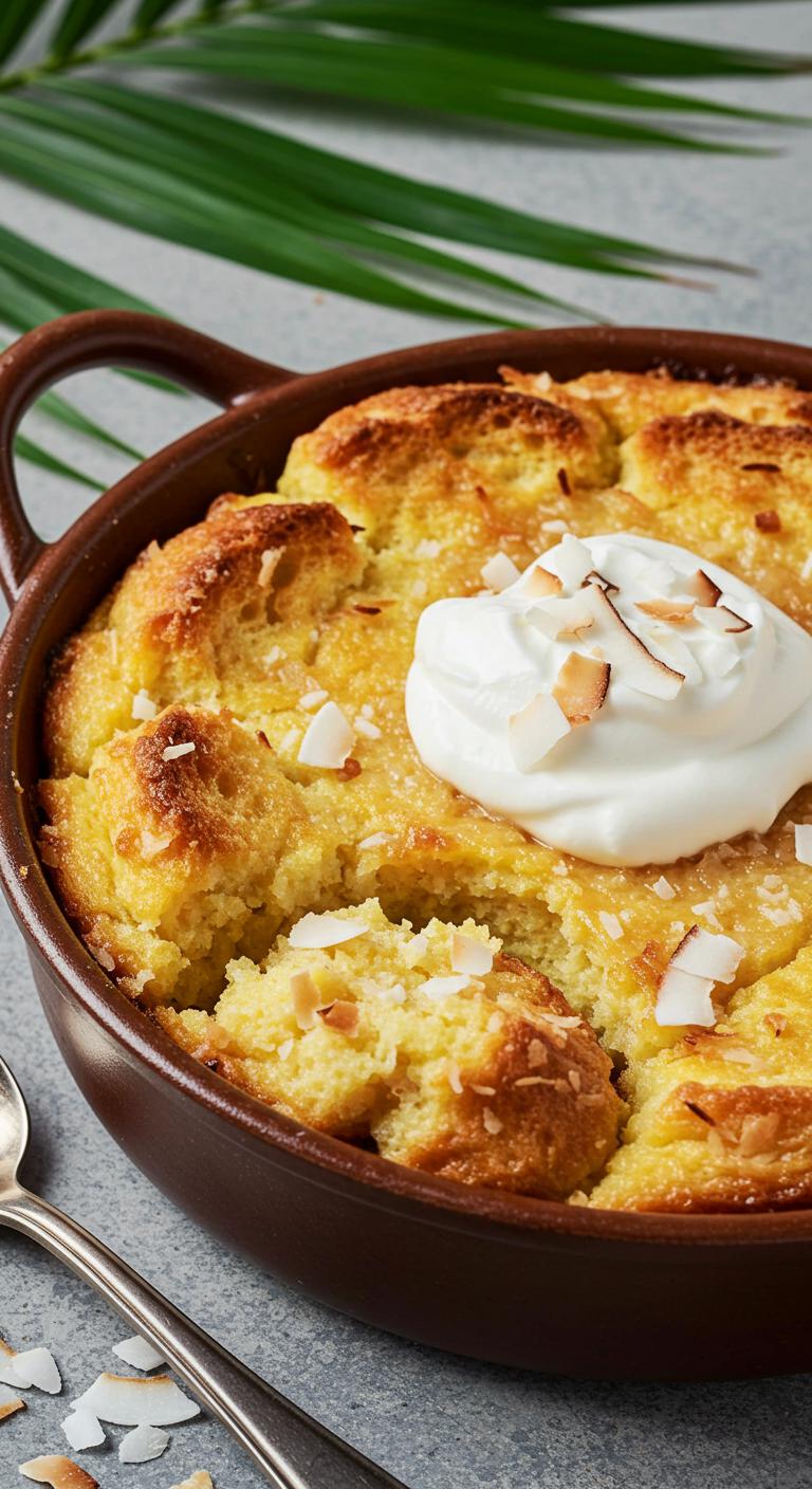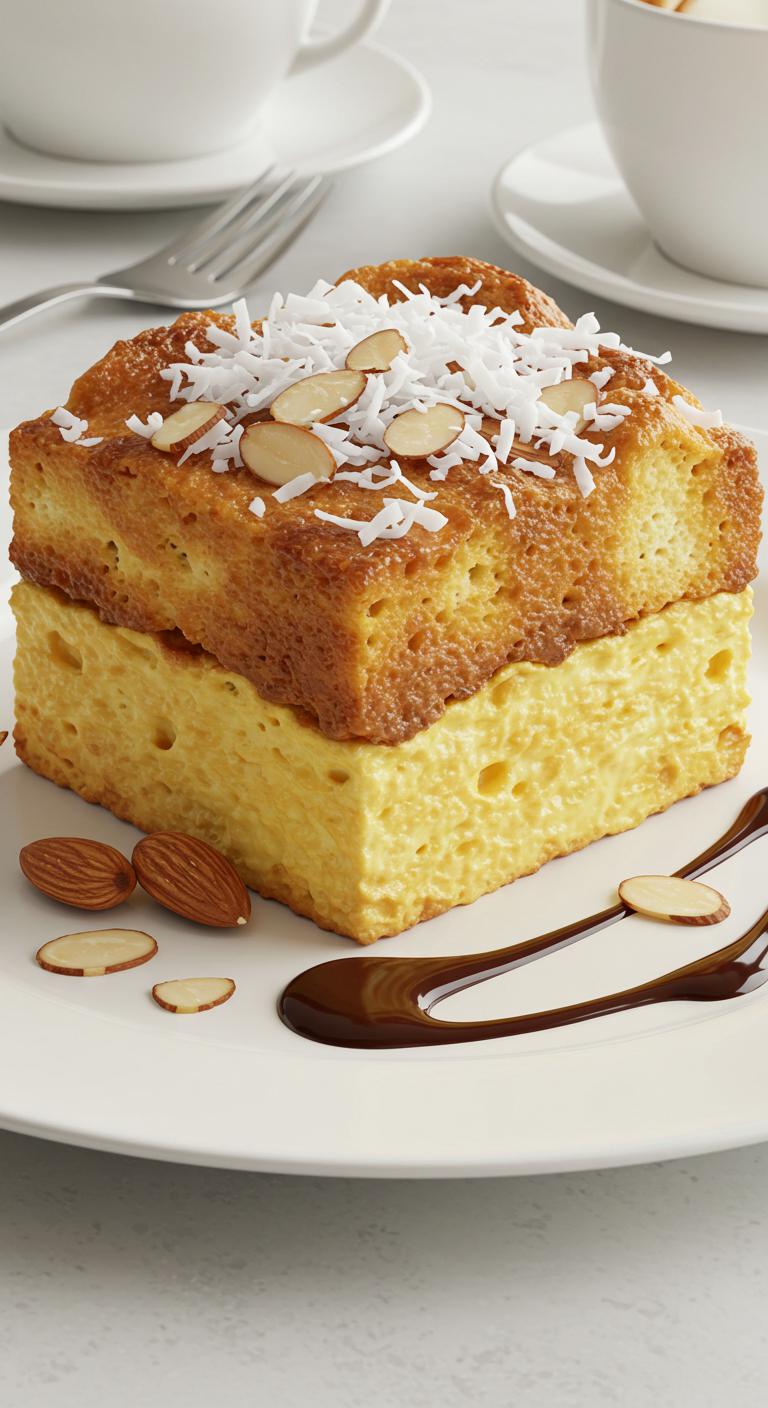- Whisk coconut milk, eggs, and sugar; fold in bread and coconut.