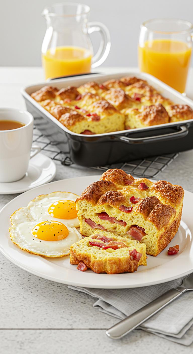 - Combine milk, eggs, cheese, and bacon in a bowl; mix with bread.