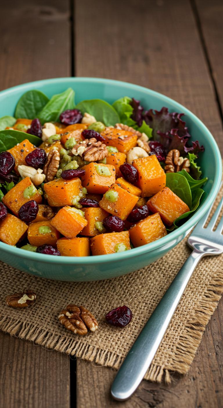 - Combine greens, squash, walnuts, and cranberries in a bowl.