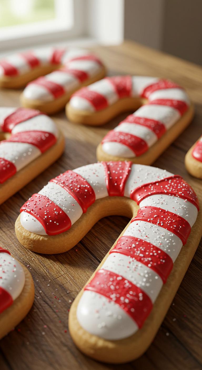 - Roll into ropes, twist together, shape into candy canes, and bake at 350°F for 10-12 minutes.
