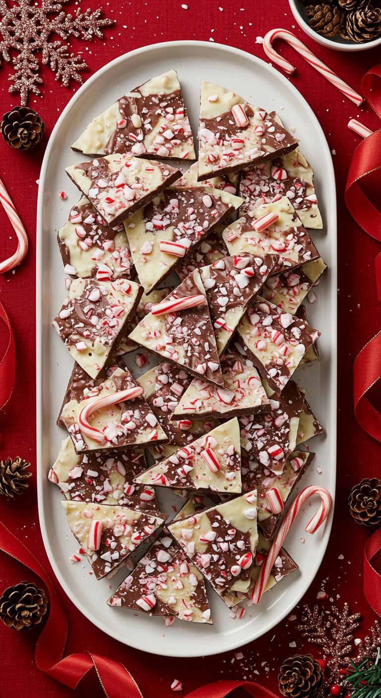- Melt the white chocolate, pour over the dark layer, and sprinkle with crushed candy canes before it hardens.