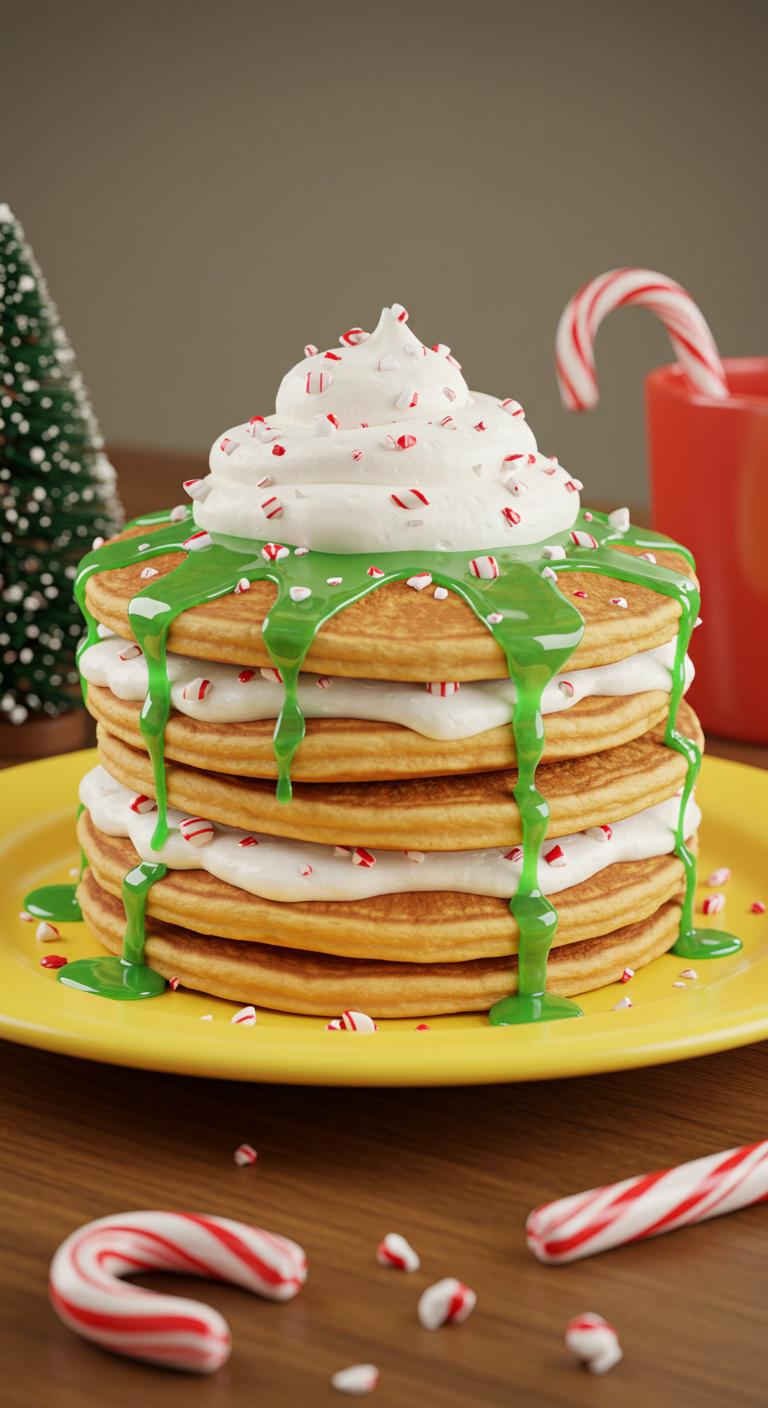 - Cook pancakes on a griddle, then top with whipped cream and crushed candy canes.