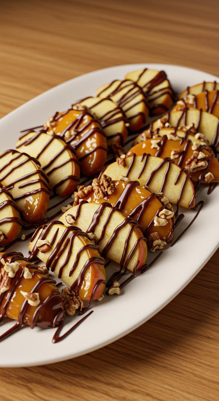 - Dip each slice in caramel, then roll in nuts.