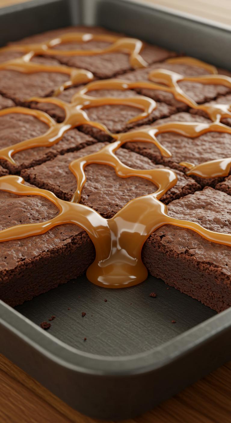 - Pour half into the dish, layer with caramel, then top with remaining batter.