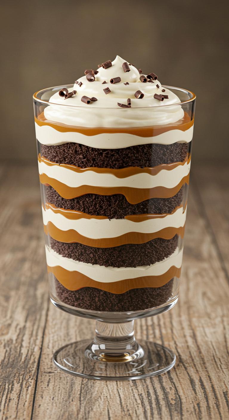 - Layer chocolate cake, whipped cream, and caramel in a glass.