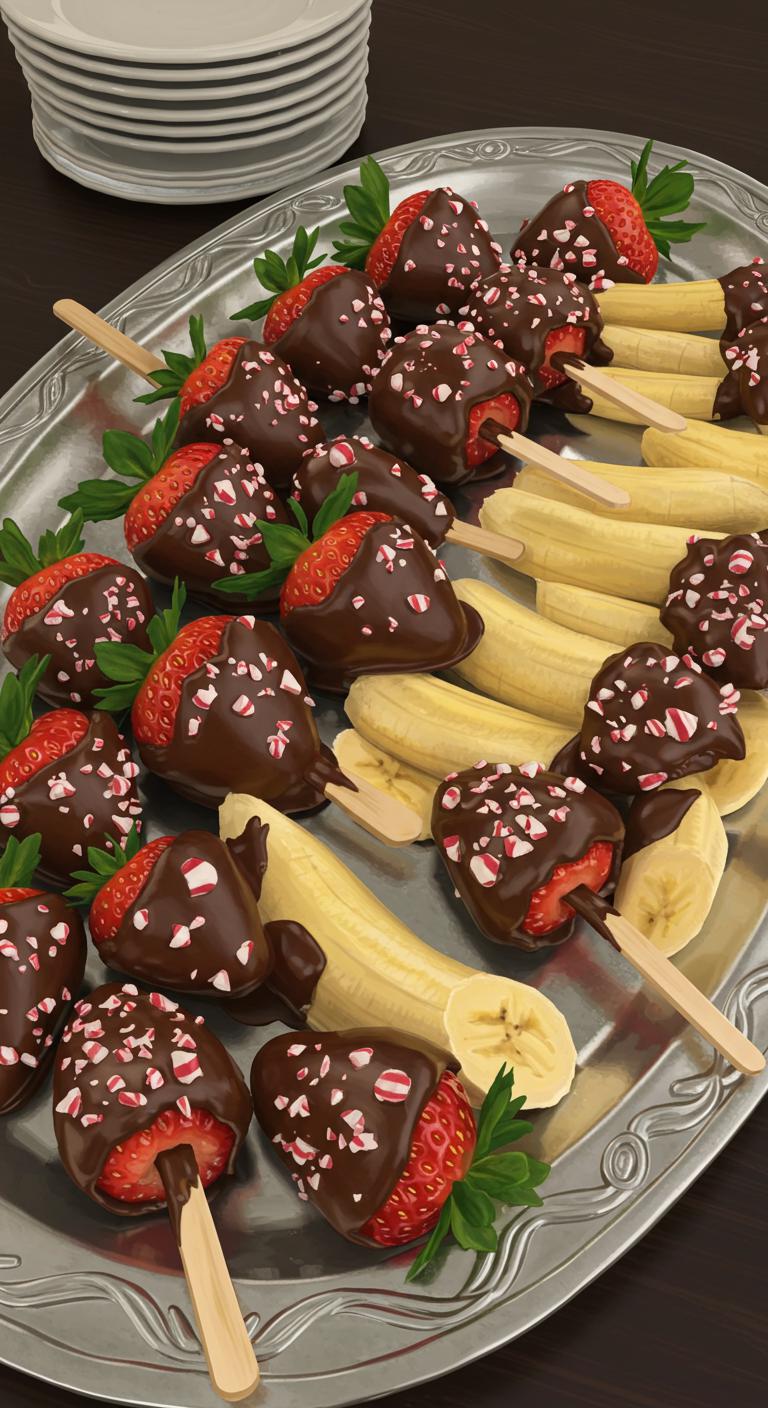 - Dip fruit into chocolate, then immediately coat with peppermint.