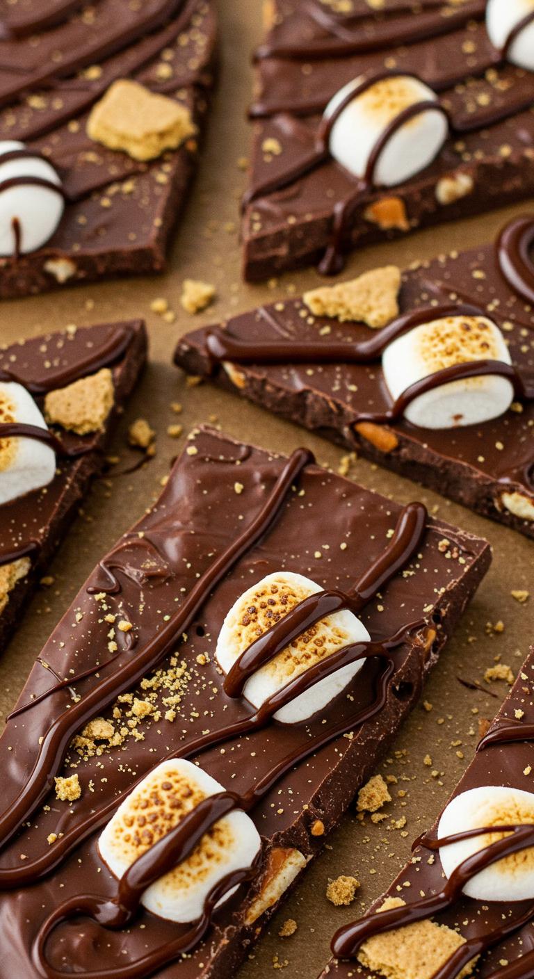 - Top with graham crackers and mini marshmallows, drizzling extra chocolate on top.