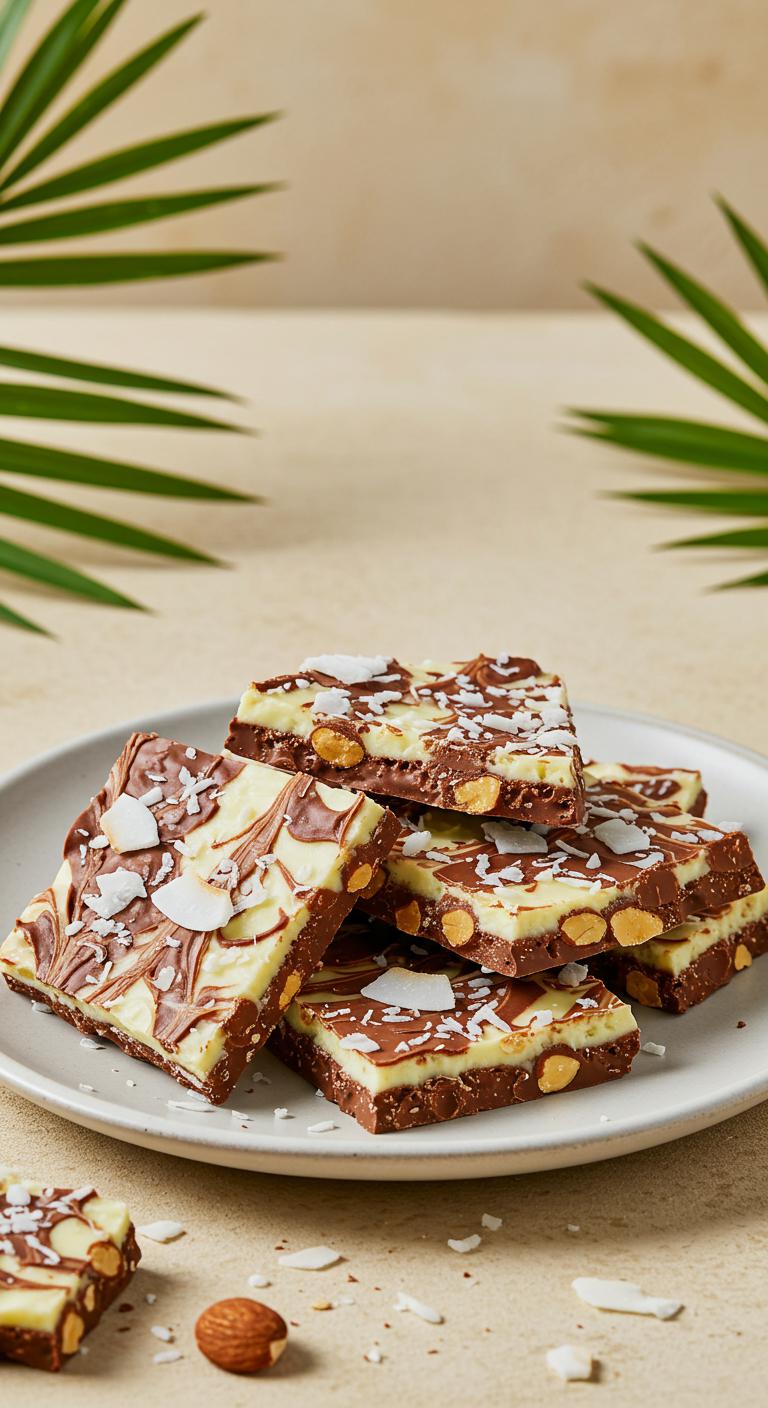 - Melt white chocolate and mix in coconut flakes and almonds.