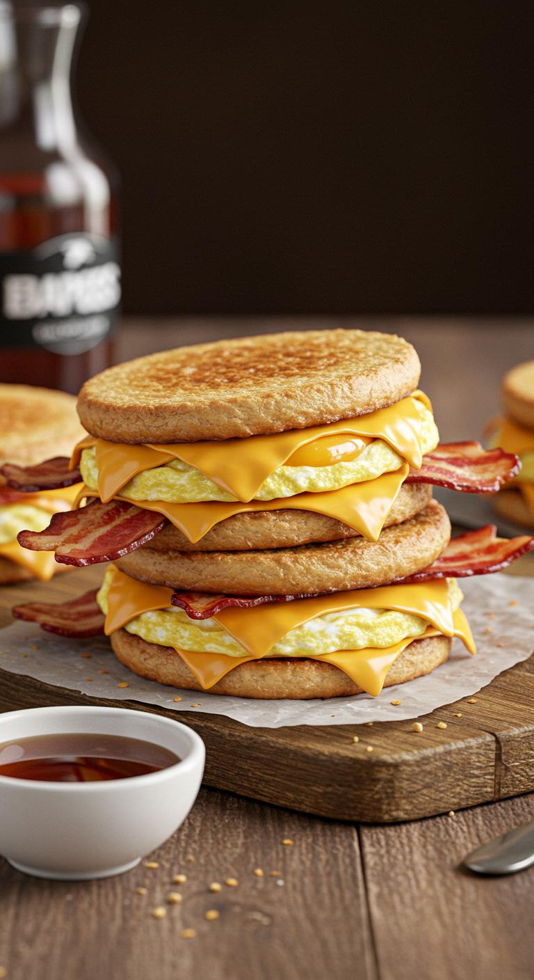 - Assemble sandwiches by layering bacon, egg, and cheese on English muffins. Drizzle with maple syrup before serving.