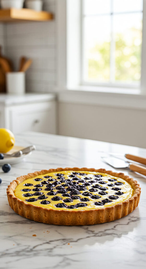 - Blend blueberries, sugar, lemon juice, and eggs; pour into the tart shell.