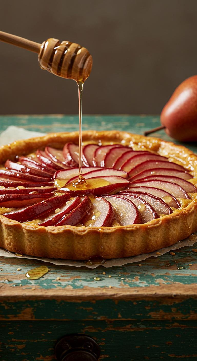 - Toss pear slices with cinnamon and honey; arrange in the tart shell.