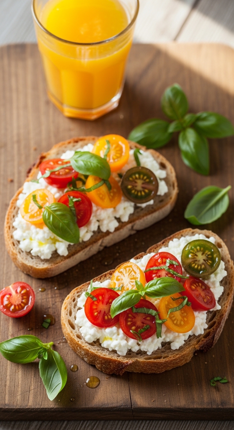 This avocado-free toast swaps mashed avocado for cottage cheese for a tangy, protein-rich base. Juicy cherry tomatoes and fresh herbs brighten the creamy spread. It’s quick, savory, and perfect for a weekday breakfast or light brunch. You’ll love the contrast between crunchy toast and silky cottage cheese. The smell of olive oil and fresh basil wakes you up.