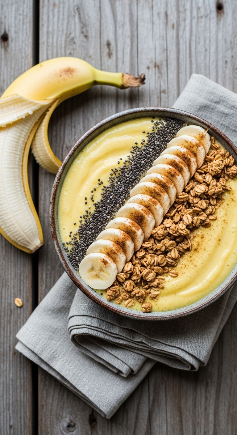 Serve in a wide bowl to show toppings. Garnish with a dusting of cinnamon and a mint sprig. Pair with black coffee or a green tea. Store leftover smoothie in fridge for up to 12 hours, stirring before serving. Make ahead by freezing pre-portioned banana and oats — blend in minutes.