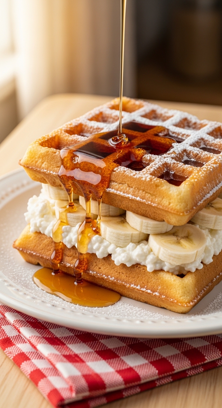 Layer cottage cheese between waffles and top with banana slices and maple syrup. Add toasted walnuts or granola for crunch. Pair with cold brew or a fruit smoothie. Store waffles in fridge for 2 days or freeze; reheat in toaster or oven for best texture. Batter is best used immediately.