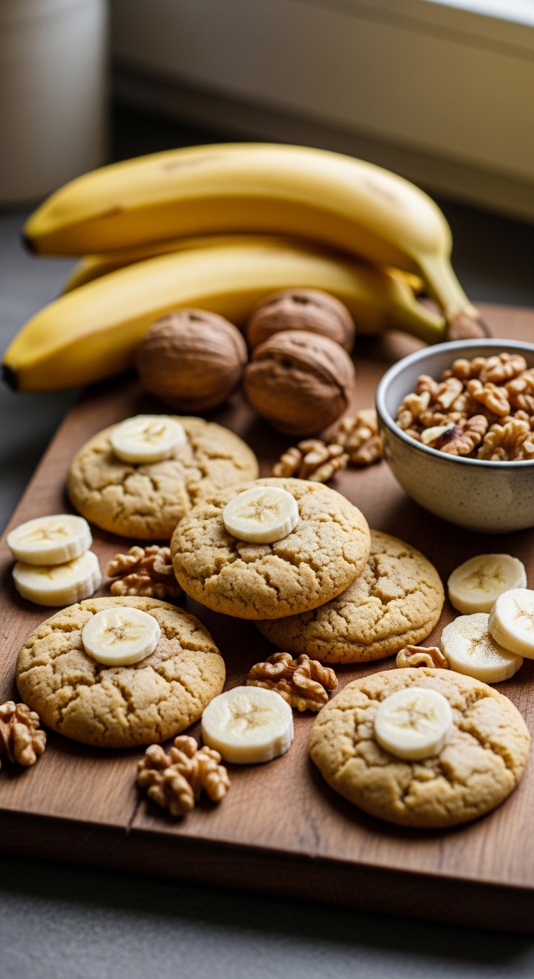 Top with a walnut half and banana slice for presentation. Pairs with morning coffee or yogurt. Store airtight up to 3 days, or freeze dough balls.