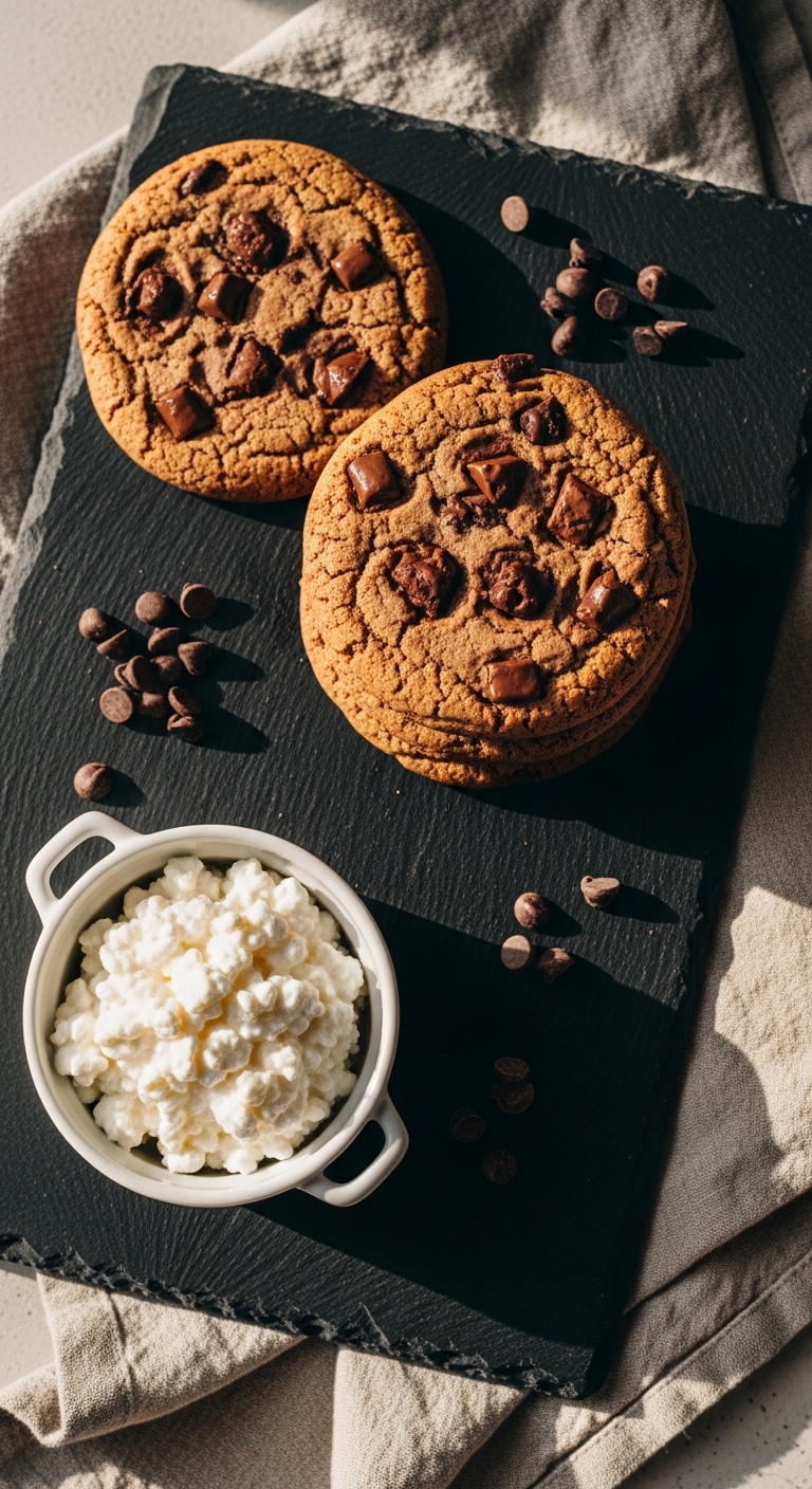 For chocolate lovers who want extra protein, these are rich, fudgy cookies with cottage cheese for moisture. Intense cocoa flavor meets melty chips. Great for dessert or a decadent snack. You’ll taste deep chocolate and experience a soft, chewy center. They smell like a warm chocolate brownie.