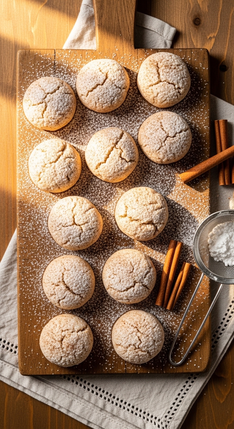 Arrange on a cake stand dusted with extra cinnamon. Pair with spiced tea or warm cider. Store in airtight container at room temp for 3-4 days. For make-ahead, freeze dough balls and bake from frozen with 1–2 extra minutes.