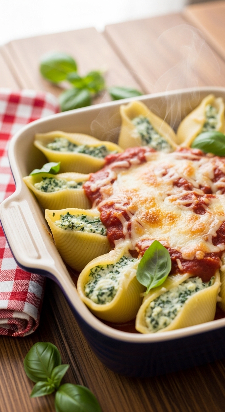 Serve shells on warmed plates with a drizzle of extra virgin olive oil. Garnish with chopped fresh basil and cracked black pepper. Pair with a crisp green salad and crusty garlic bread. Store leftovers covered in the fridge for up to 3 days. Assemble ahead and refrigerate unbaked; bake when ready for dinner. Great for cozy weeknights or casual gatherings.