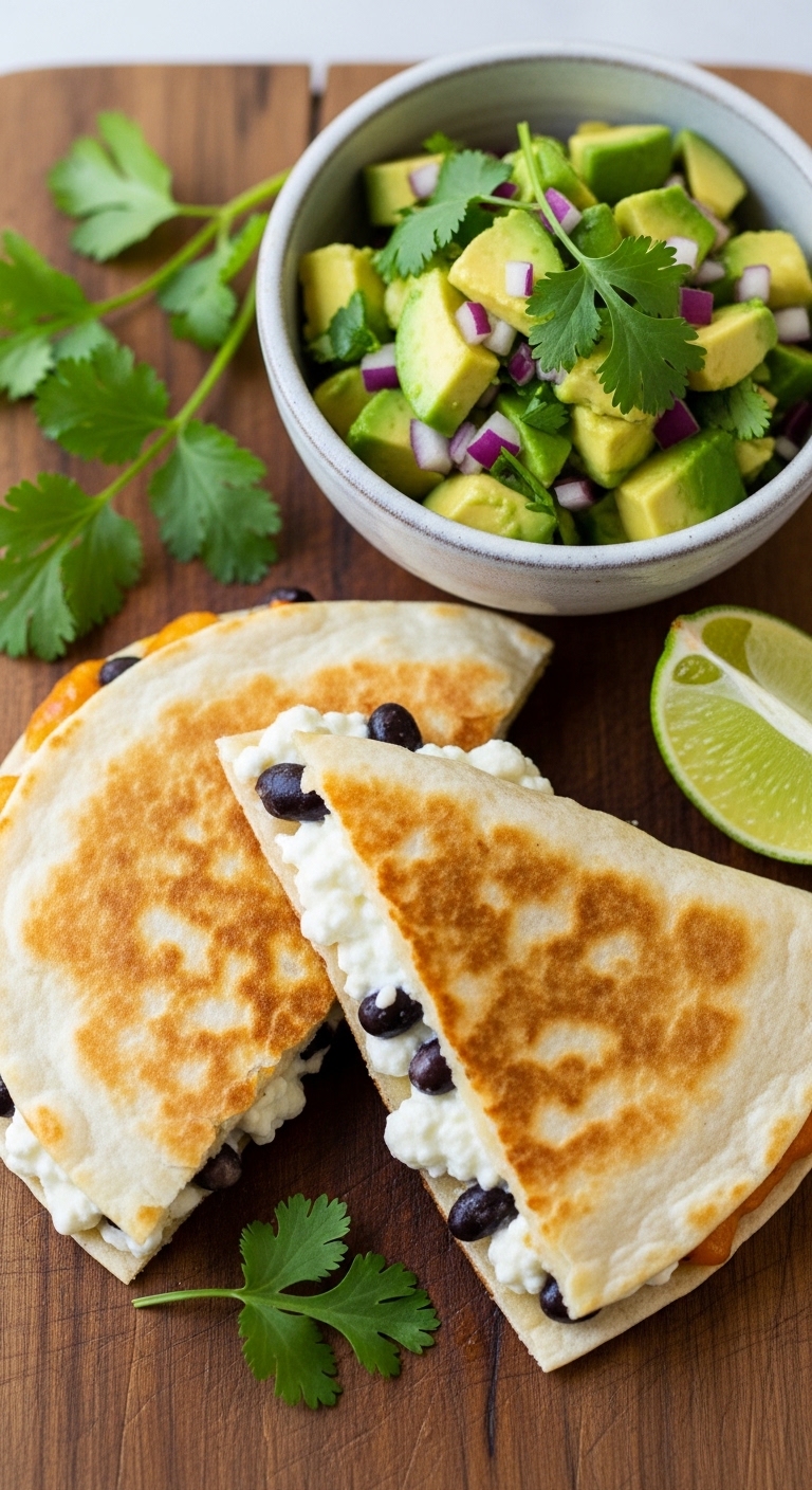 Cottage cheese makes these quesadillas creamy and protein-packed. Black beans and corn add texture and heartiness. They cook quickly in a skillet for a crispy exterior and melty center. Flavor is tangy, smoky, and fresh from the salsa. Kids love the melted cheese texture; adults enjoy the fresh avocado salsa.
