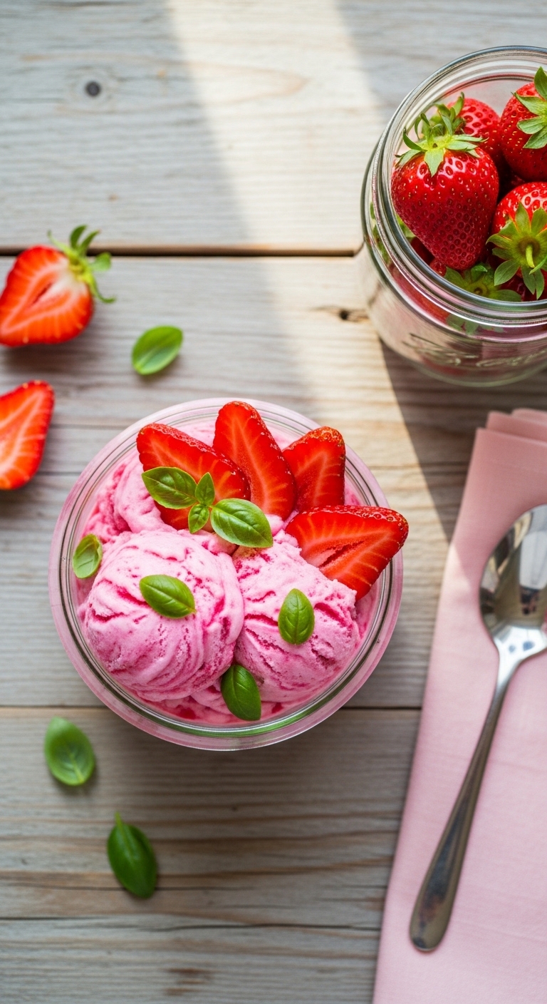 Serve in coupe glasses with extra basil sprigs and a strawberry fan. Drizzle with aged balsamic for a grown-up twist and pair with prosecco. Store airtight up to 5 days. Make the strawberry swirl ahead and freeze; let soften before plating for the best texture.