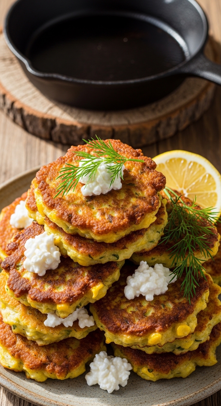 Stack fritters and garnish with a dollop of cottage cheese or tzatziki and fresh dill. Serve with a side salad or lemon wedges. Store in fridge up to 3 days; reheat in a skillet for crispiness. Fritters freeze well—flash-freeze then store in a freezer bag.