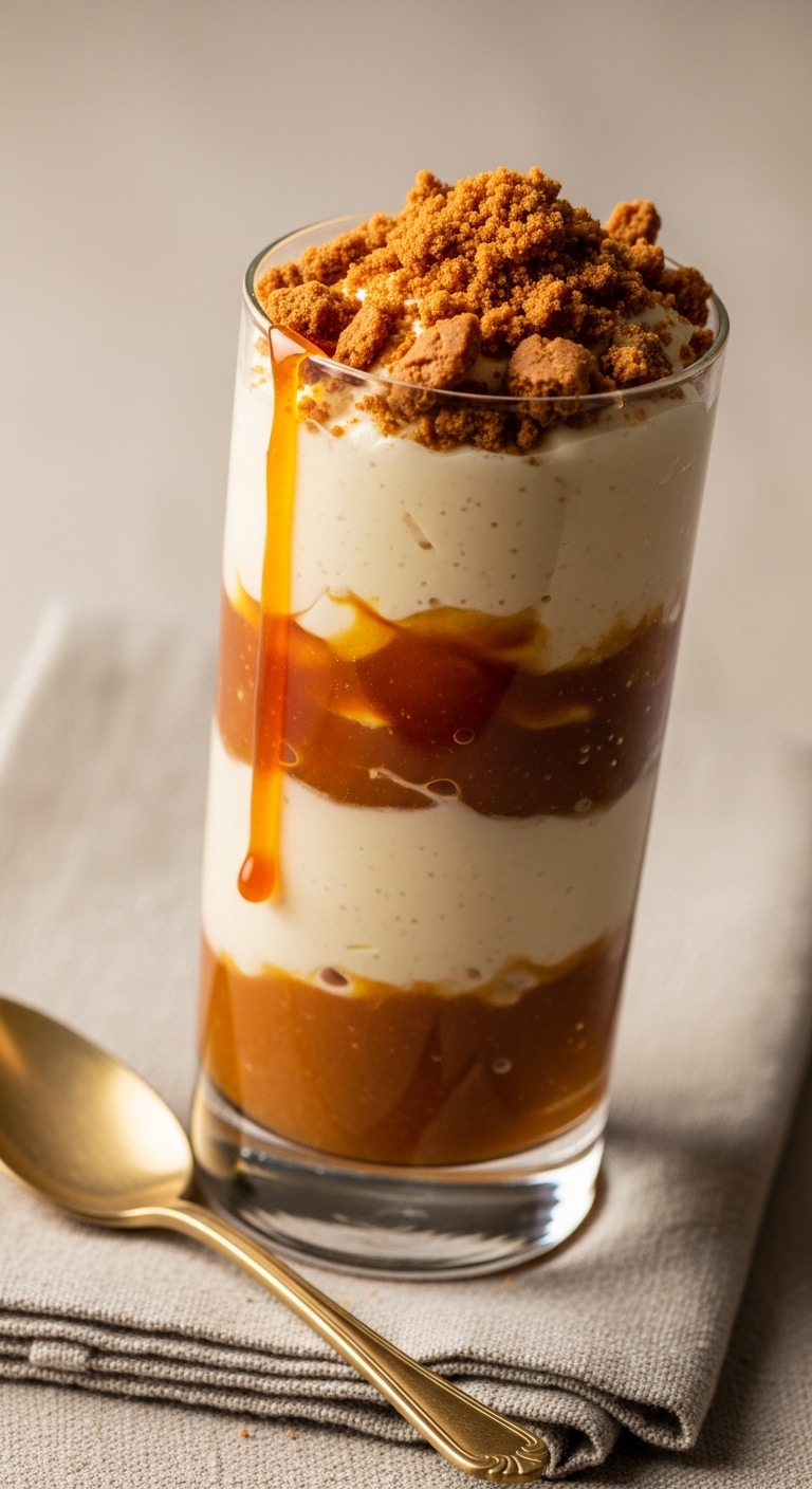 Serve tall parfaits with a long spoon. Pair with espresso or dessert wine. Cover and refrigerate for 2 days. Make components ahead: keep crumbs dry and caramel separate until assembly.