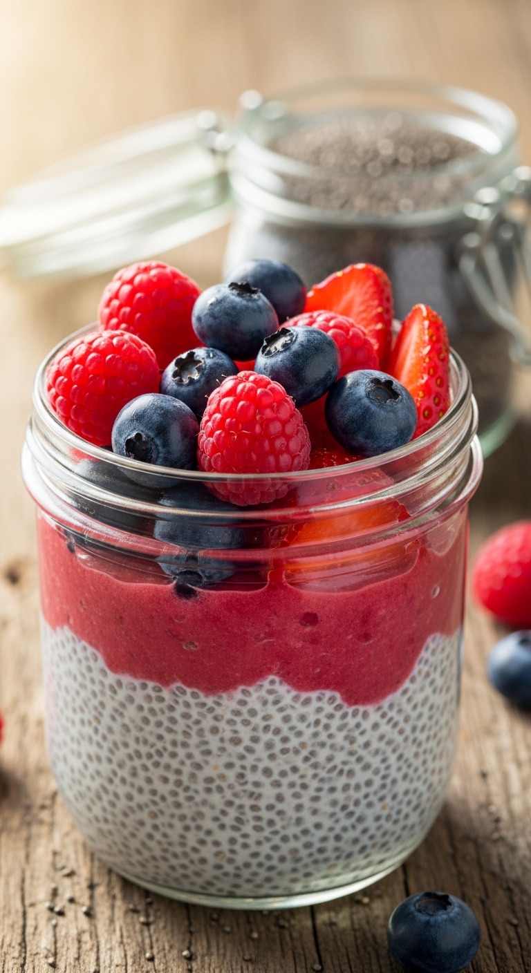 This pudding balances protein and fiber. Chia seeds create a gentle gel that gives a spoonable texture. Bright berry puree brightens every bite. It’s great for make-ahead breakfasts or a light dessert.