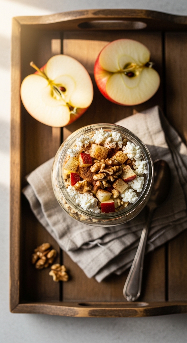 These overnight oats use cottage cheese for extra creaminess and protein. Apples add natural sweetness and cinnamon adds warmth. It’s an easy, portable breakfast you can prep the night before. You’ll love the creamy texture with crunchy walnuts. The scent is cinnamon and warm apple.