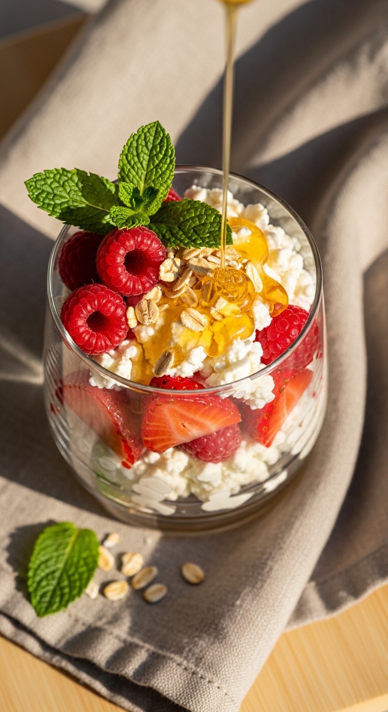 This berry parfait is bright and simple. Creamy cottage cheese meets tart berries and a whisper of honey. The texture is creamy, with a little crunch from toasted oats. It’s a sweet, fresh snack under 200 calories you can grab any time. You’ll love it if you want a chilled, fruity high-protein snack that looks pretty too. The scent of berries and honey makes it feel like a mini treat.