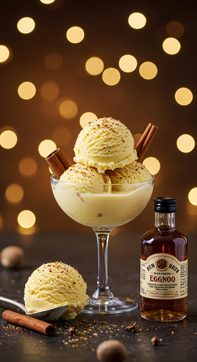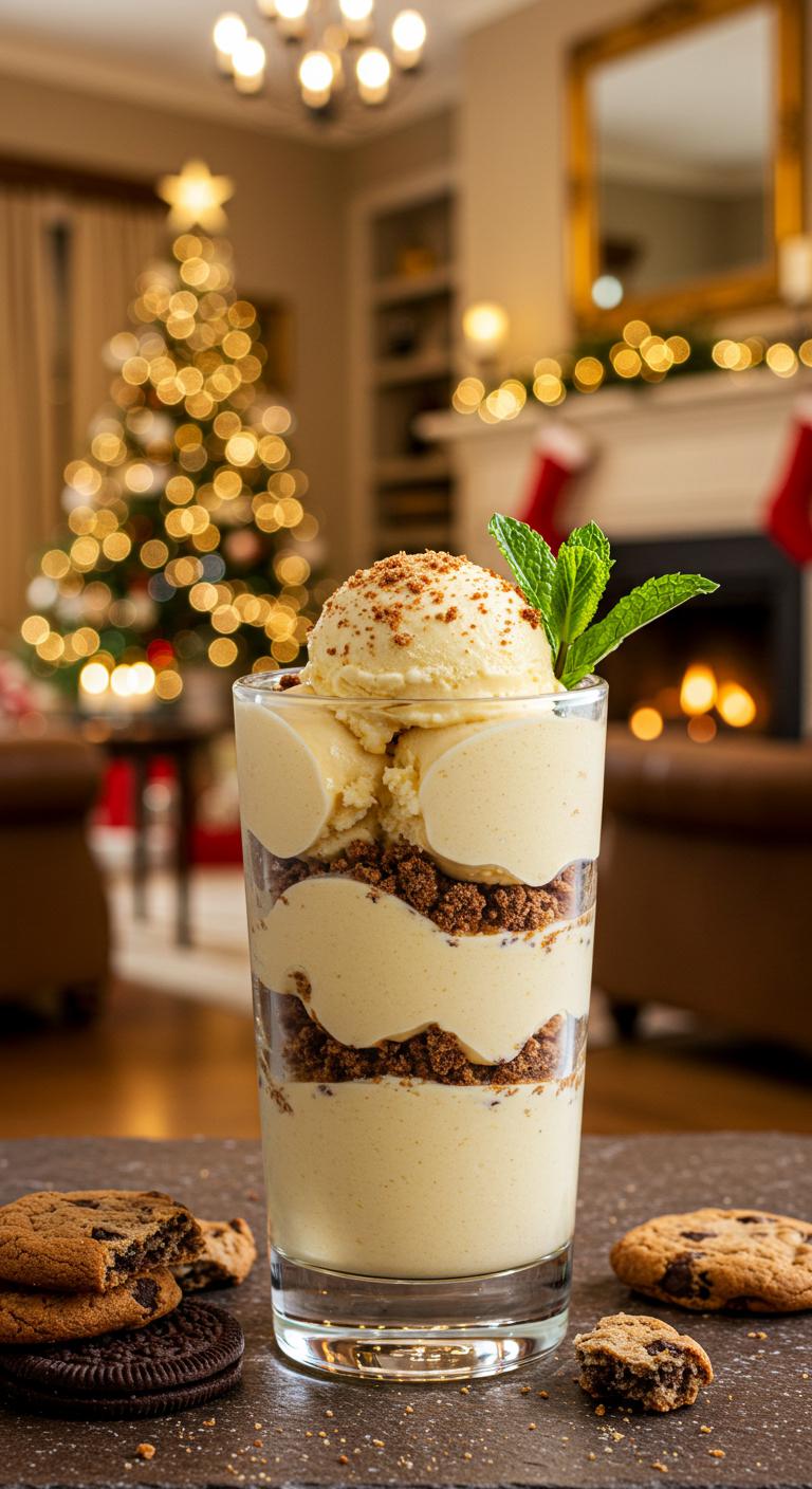 - In a glass, layer eggnog ice cream, crushed cookies, and whipped cream.