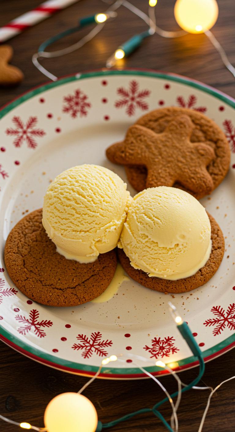 - Scoop eggnog ice cream onto a gingerbread cookie and top with another cookie.