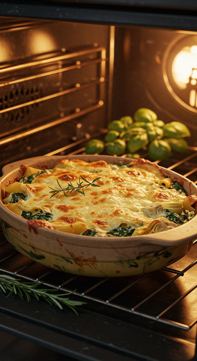 - Mix spinach, artichokes, cream cheese, and pasta in a baking dish; top with mozzarella.