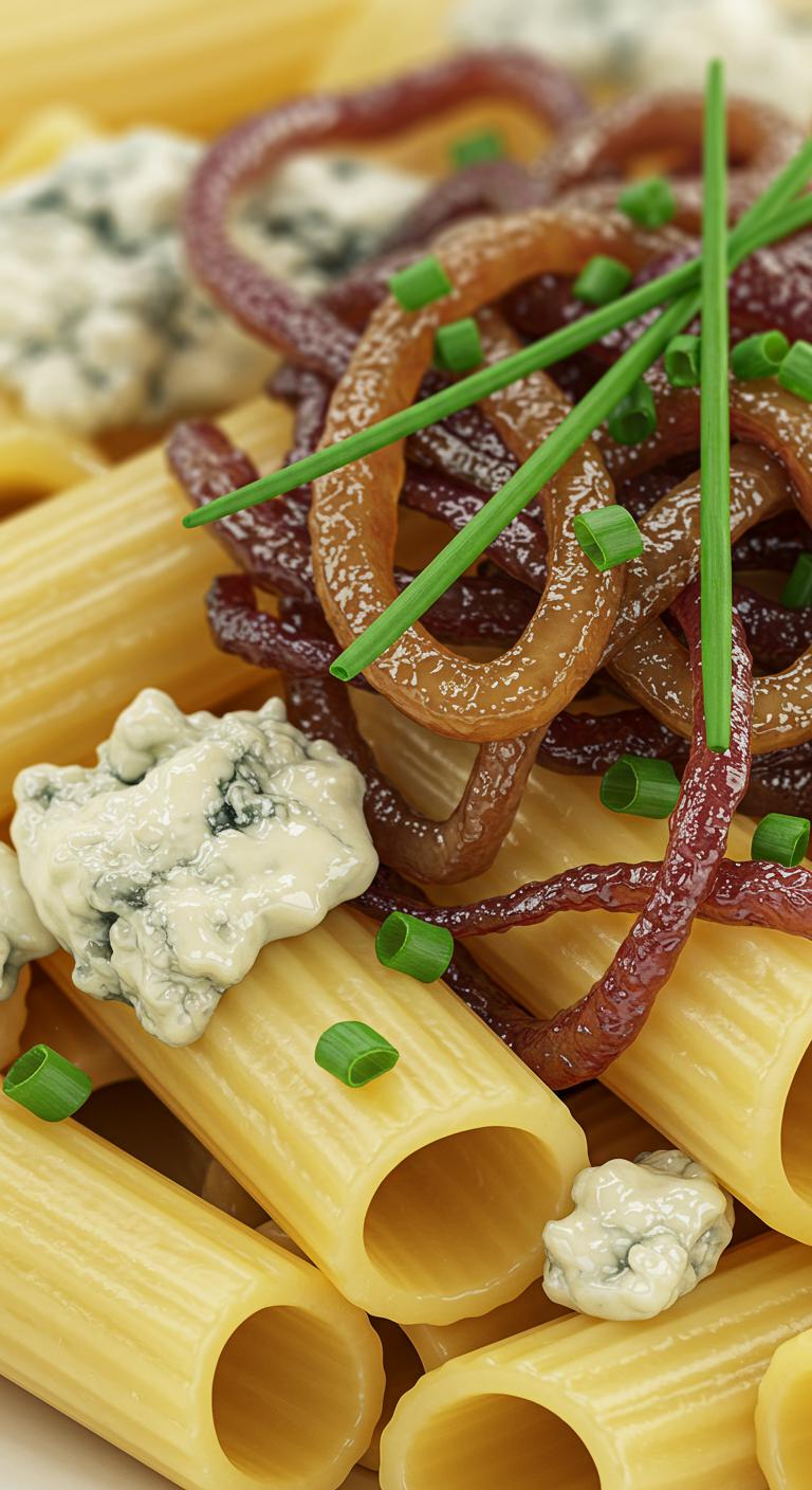 - Cook pasta; toss with onions and gorgonzola to melt.