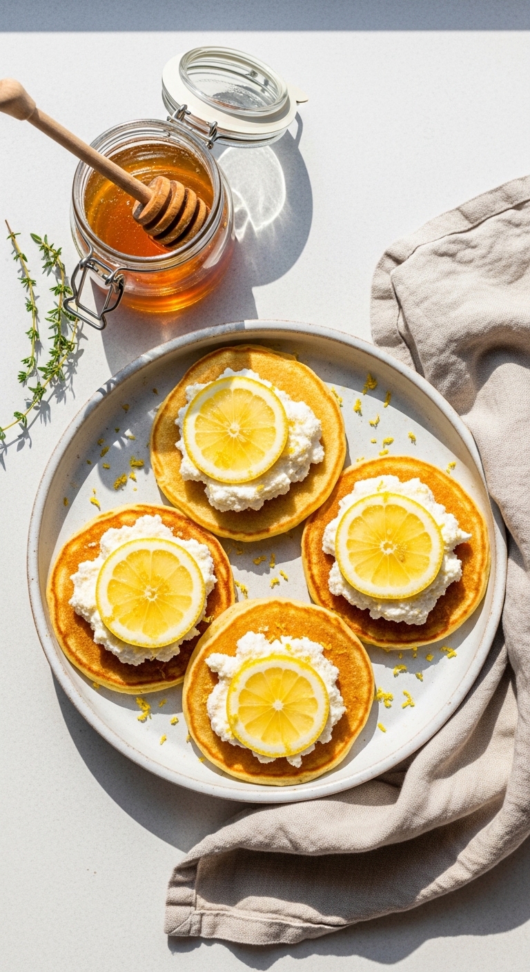 Top with a spoonful of ricotta and a drizzle of honey. Garnish with thin lemon slices and fresh thyme or mint. Pair with sparkling water or Earl Grey tea. Store leftovers up to 2 days refrigerated. Reheat on a griddle or in the oven at 300°F (150°C) for 6–8 minutes. Batter (without whites) can be made a day ahead.
