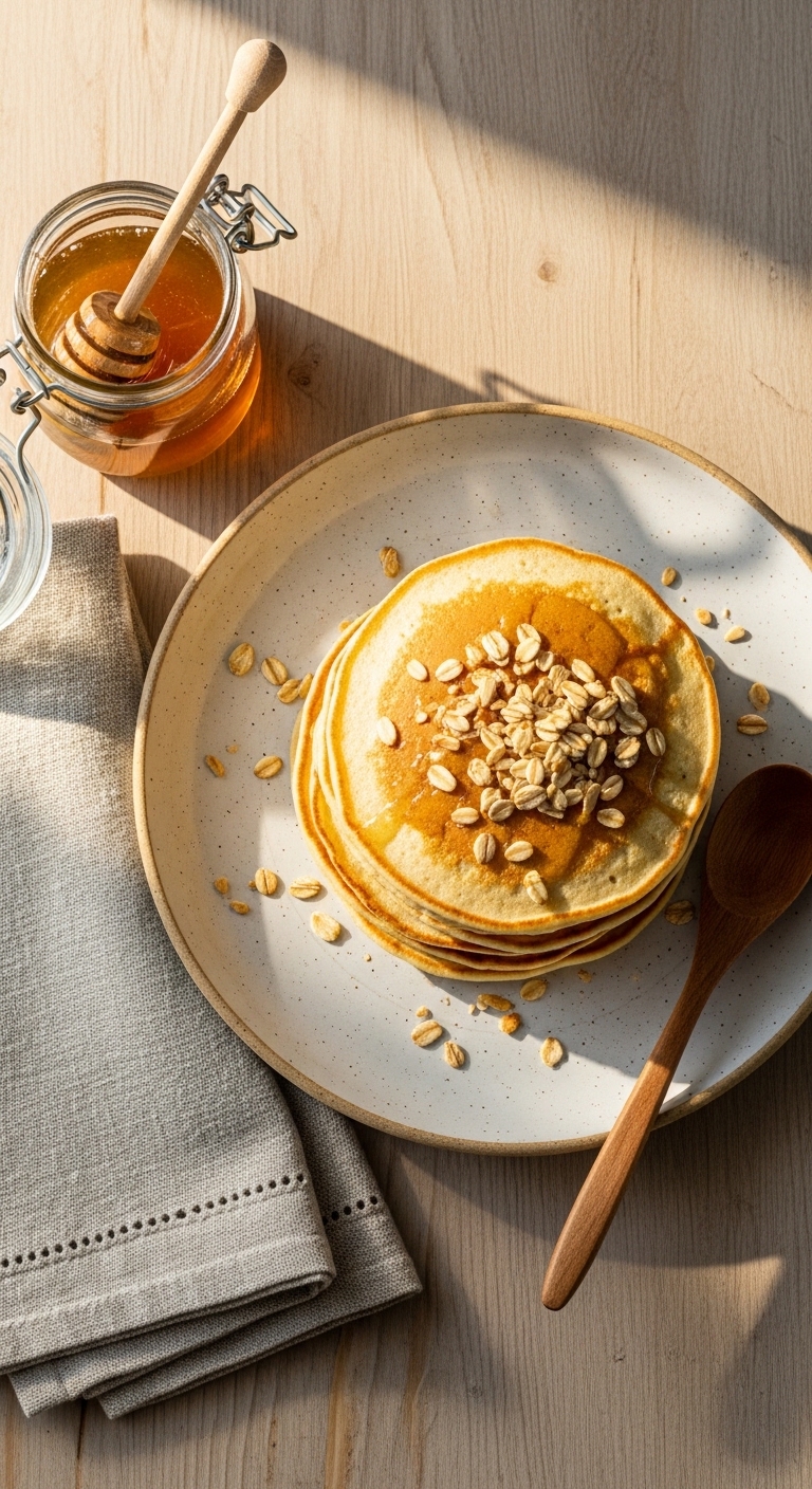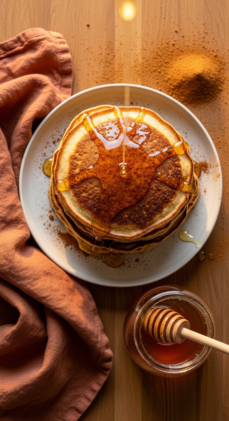 Serve with warm honey and sliced apples or pears. Sprinkle extra cinnamon and chopped walnuts. Pair with chai tea or cold milk. Store pancakes in an airtight container in the fridge for 3 days. For make-ahead, freeze flat and reheat on a skillet.