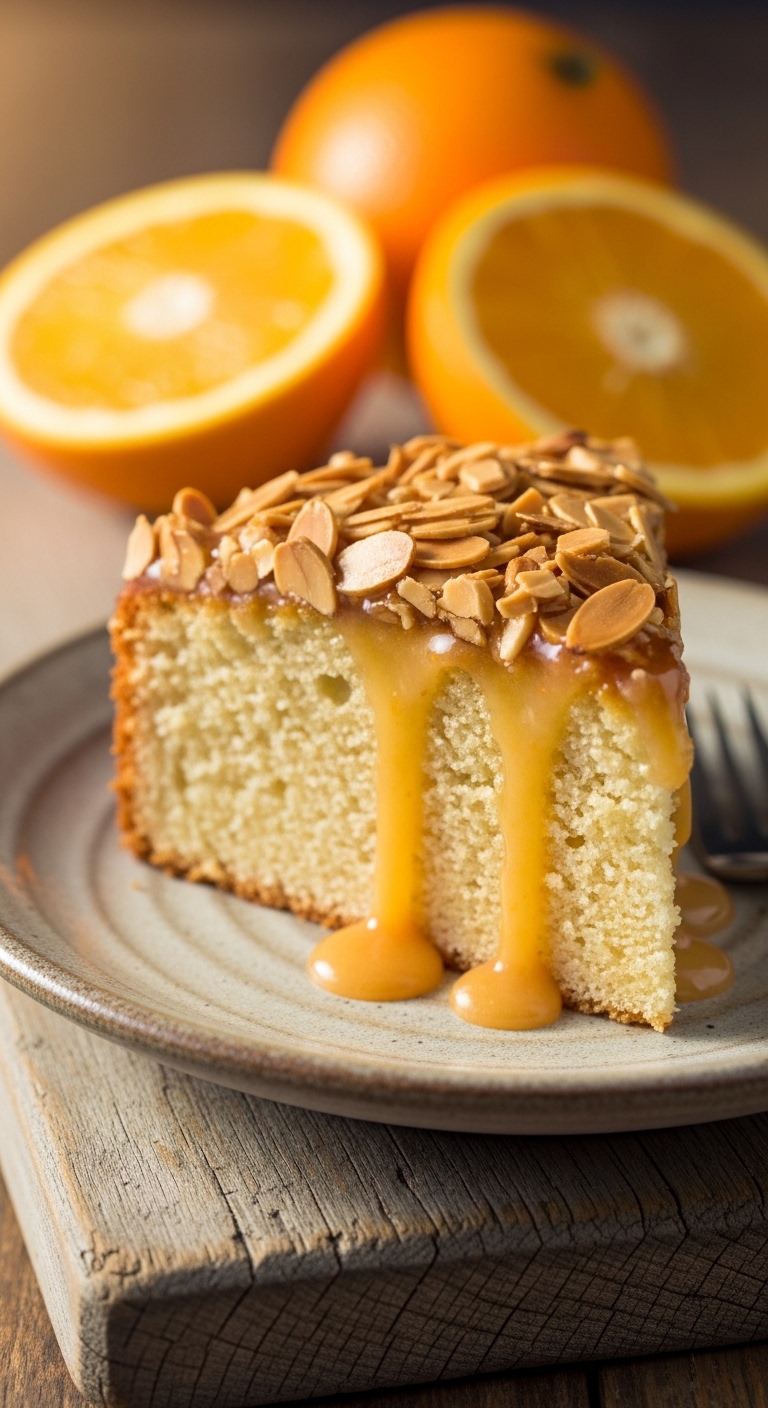 Serve with whipped cream and extra toasted almonds for crunch. Garnish with orange segments and a sprig of rosemary for color. Pair with Ceylon tea or a light white wine. Store in an airtight container in the fridge for 3–4 days. You can bake the base a day ahead and glaze before guests arrive.