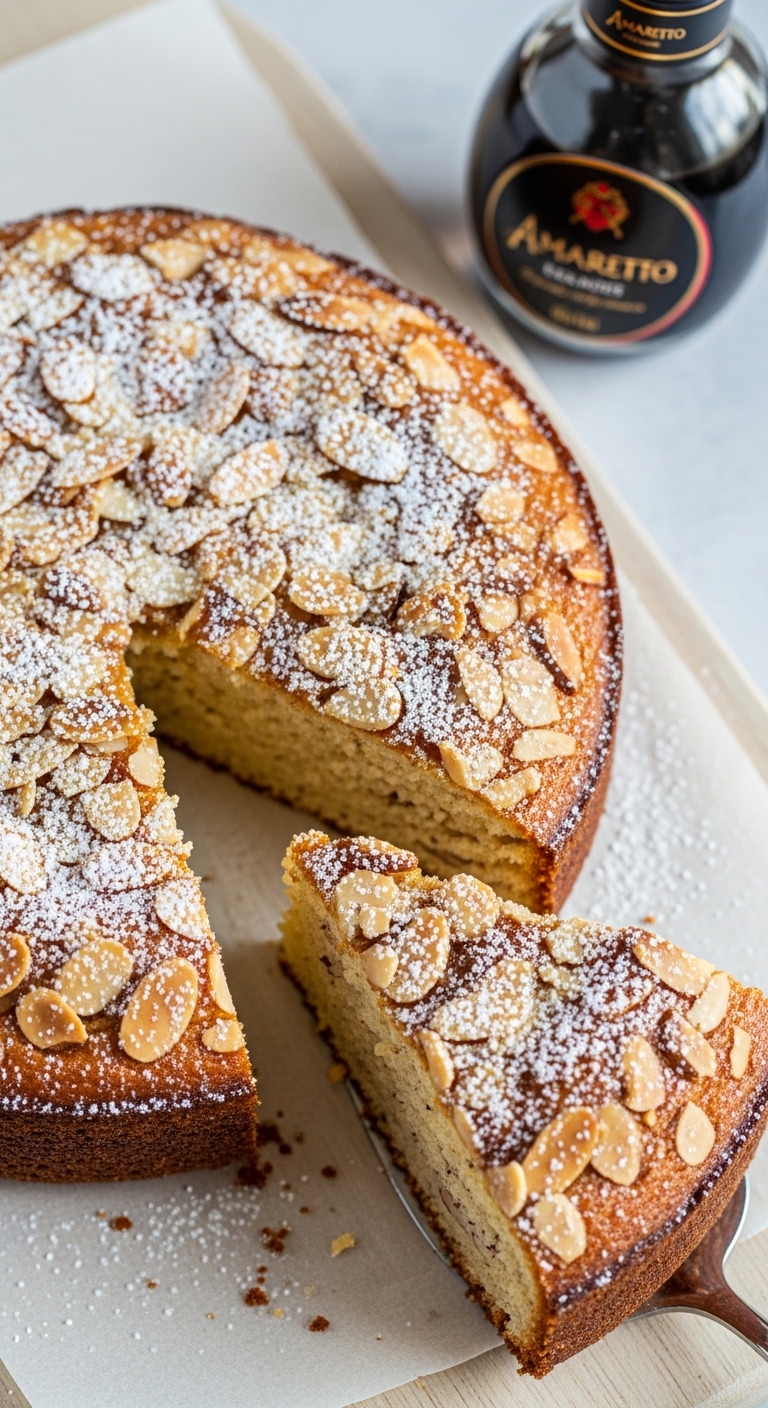Serve slices with lightly whipped cream and a drizzle of amaretto syrup. Pair with espresso or an almond biscotti. Store covered in fridge 3–4 days. Make ahead: bake and freeze unfrosted; thaw before garnishing.