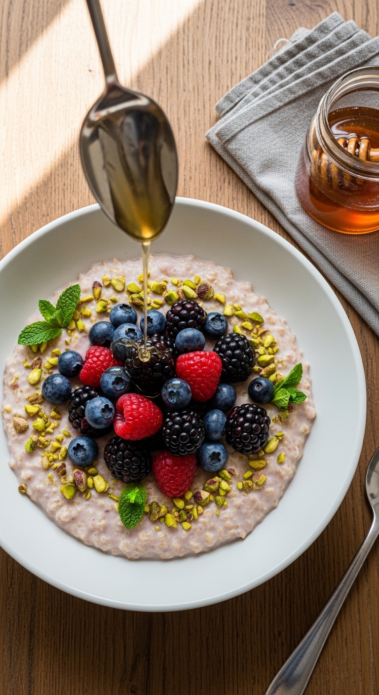 - Top with 1/4–1/2 cup berries, drizzle 1 tsp honey, and sprinkle 1 tbsp crushed pistachios. The oats are done when they are thick and spoonable.