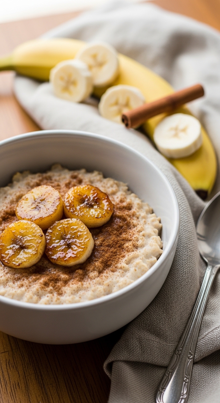 Serve warm in a deep bowl with caramelized bananas arranged on top. Add a drizzle of maple syrup for extra sweetness. Pair with a latte or chai tea. Refrigerate leftovers in an airtight container up to 48 hours. Reheat gently on the stove with a splash of milk. This feels like breakfast comfort any season.