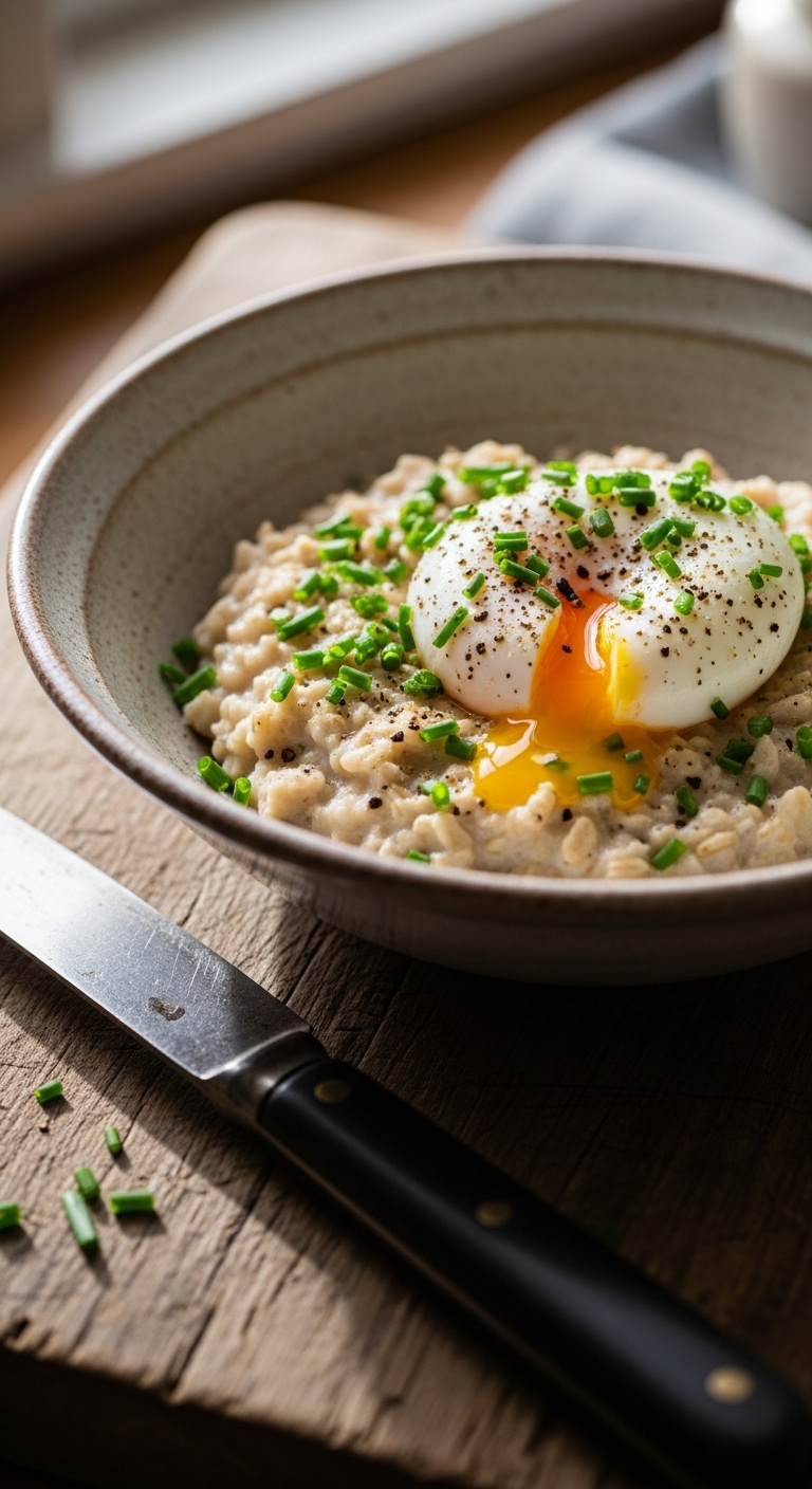 - While oats cook, poach the egg: simmer water with a splash of vinegar and cook the egg 3–4 minutes for a runny yolk.