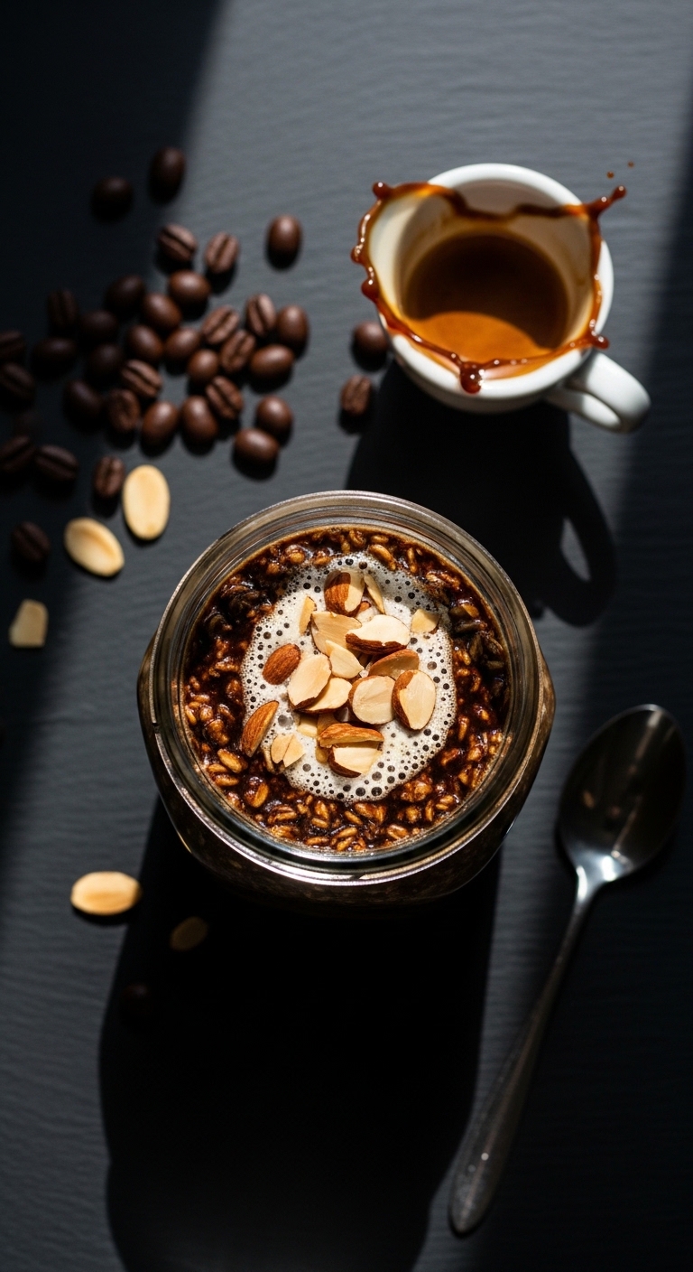 This overnight jar blends cold-brew coffee into creamy yogurt oatmeal for a wake-up twist. It’s perfect if you love coffee flavors and want a make-ahead breakfast. The texture is fluffy and set, with a nutty crunch from almonds. It’s great for busy mornings.