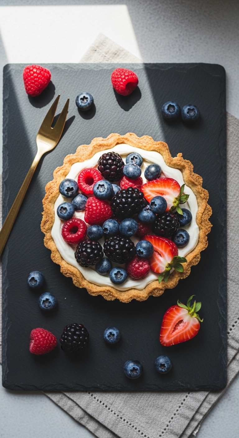 Slice on a chilled plate and garnish with mint and a dusting of powdered sugar. Pair with espresso or a citrusy tea. Store in the fridge up to 3 days; brush berries with a light apricot glaze for longer freshness. Make crust a day ahead and fill the morning you serve.