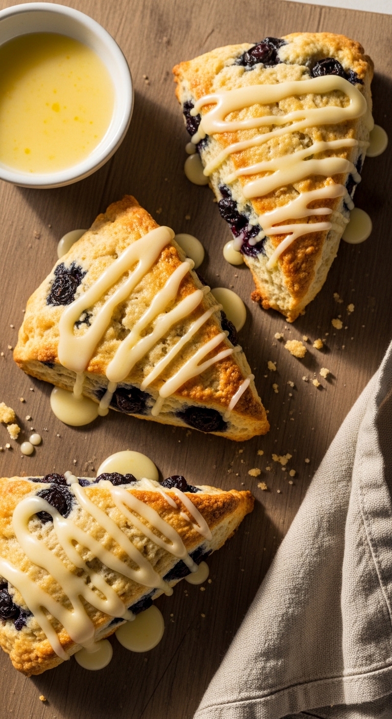 Serve warm with extra lemon zest and a pat of butter or yogurt. Pair with Earl Grey or breakfast coffee. Store in an airtight container up to 2 days; reheat briefly. Freeze unglazed scones for up to 1 month and glaze after reheating.