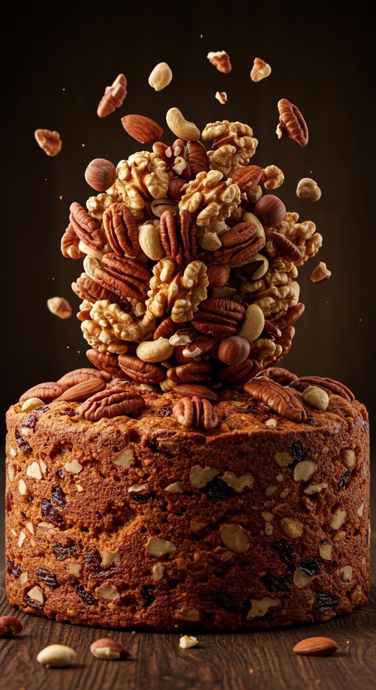 Experience the delightful crunch in every bite of this nut-packed fruitcake!