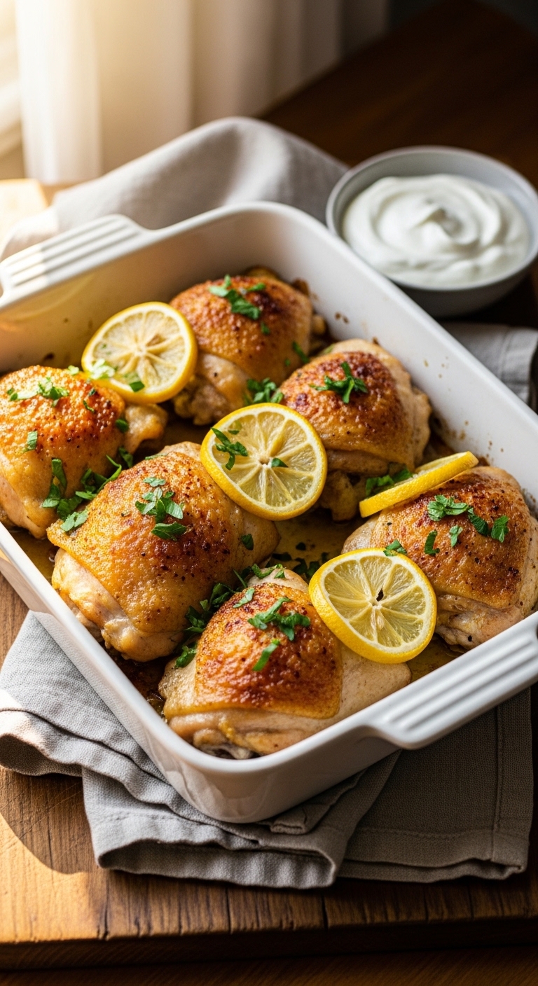 Plate thighs on a warm platter with leftover lemon slices for brightness. Garnish with more chopped parsley and a drizzle of olive oil. Pair with roasted potatoes, a simple green salad, or steamed rice. Store leftovers in an airtight container up to 3 days in the refrigerator. Reheat gently in the oven at 325°F (160°C) for 10 minutes to keep moist. Make the marinade ahead for easy weeknight dinners.