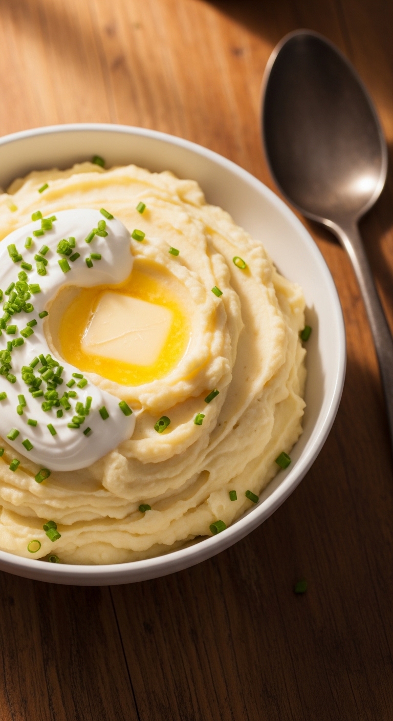 Spoon into a warmed bowl and top with a pat of butter and chive snips. Pair with roasted meats or a simple green salad. Leftovers store 3–4 days in fridge; reheat gently with a splash of milk. For make-ahead, reheat in a low oven covered with foil.